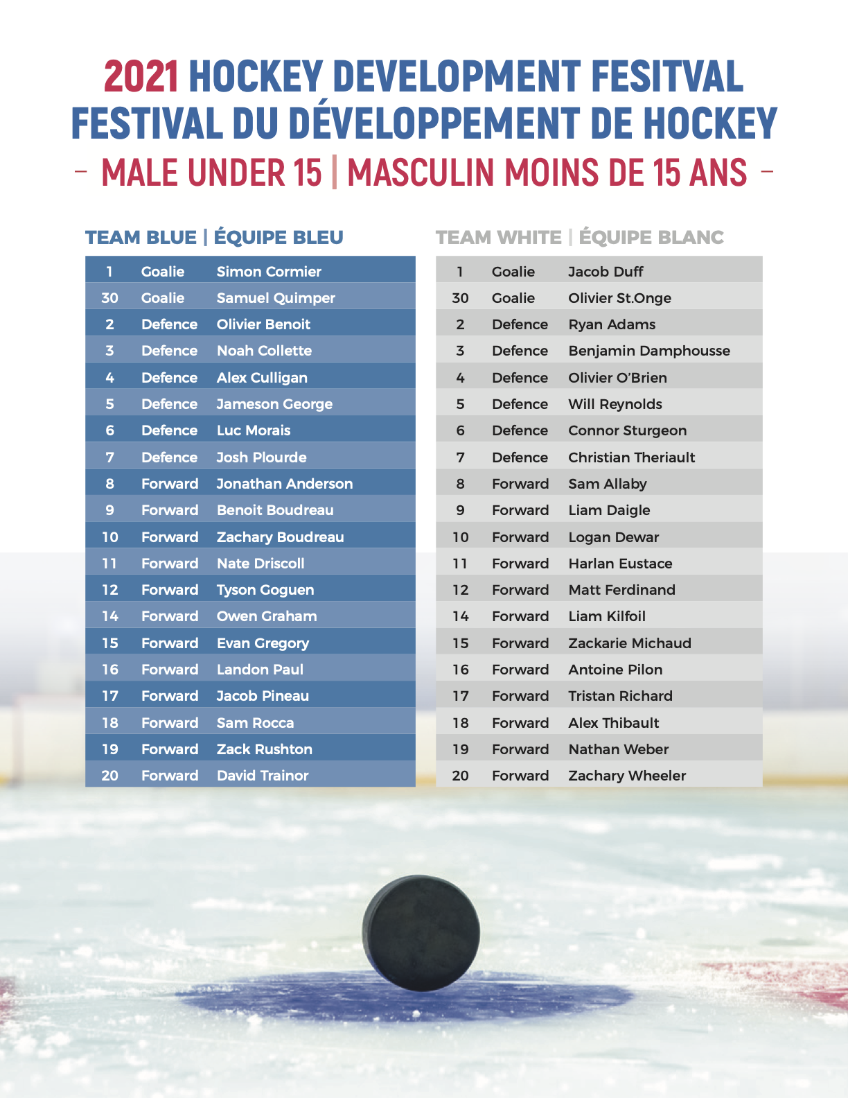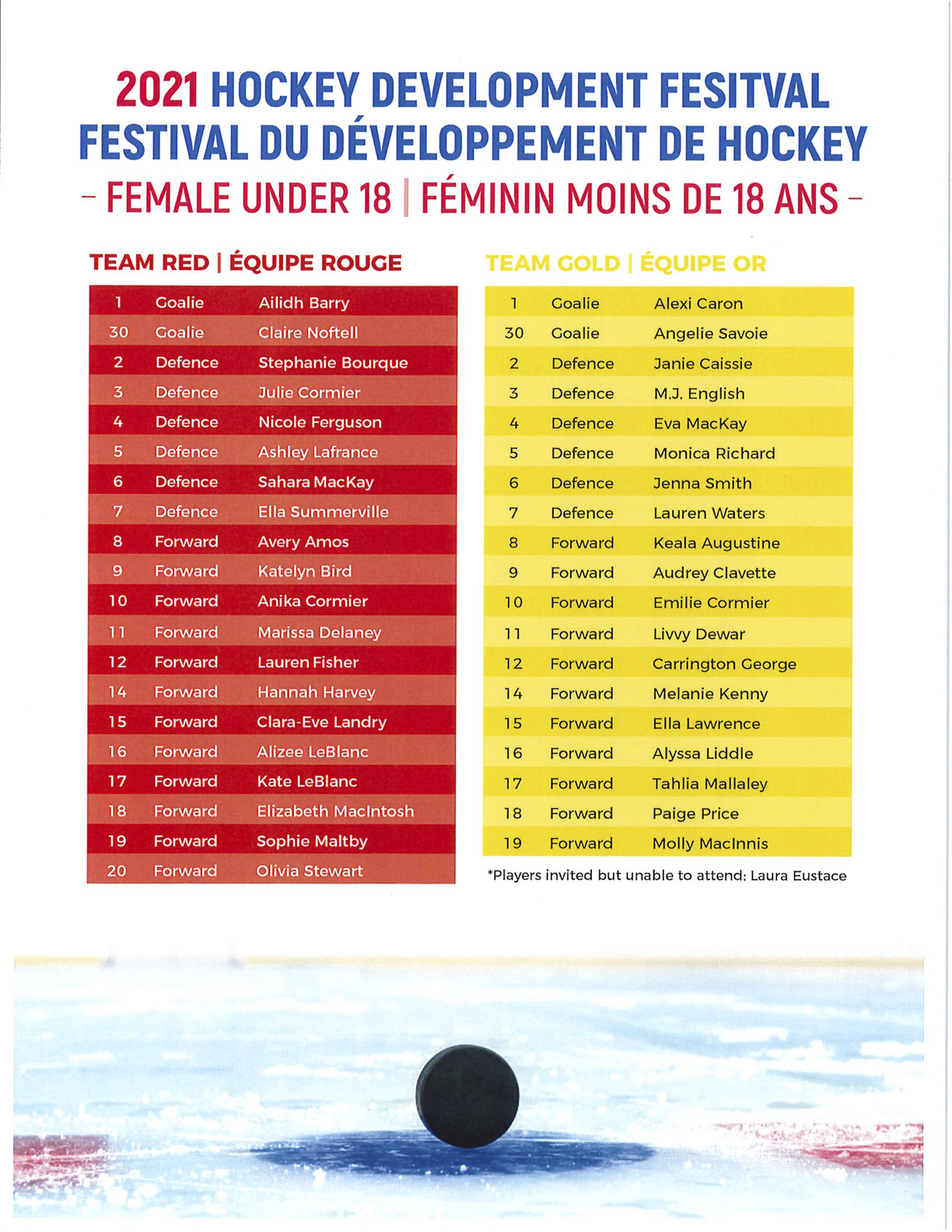 Dieppe, NB – July 16, 2021 – One hundred and twenty male and female hockey players, in three divisions have been invited to participate in the Hockey New Brunswick Development Festival beginning July 16th. The camps will run over two weeks in Dieppe at the Uniplex.