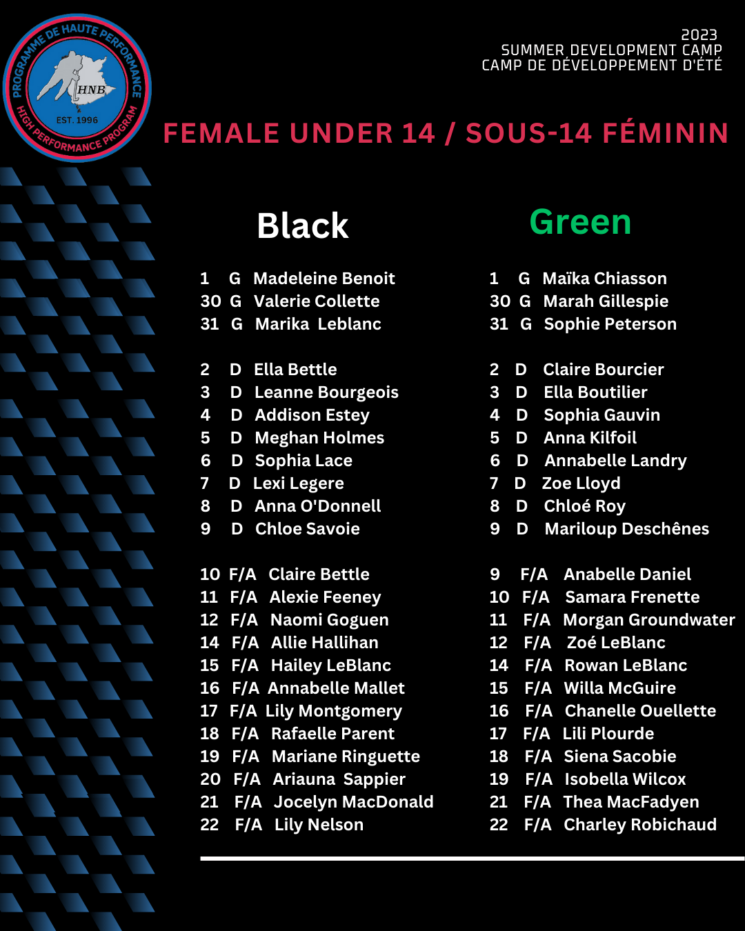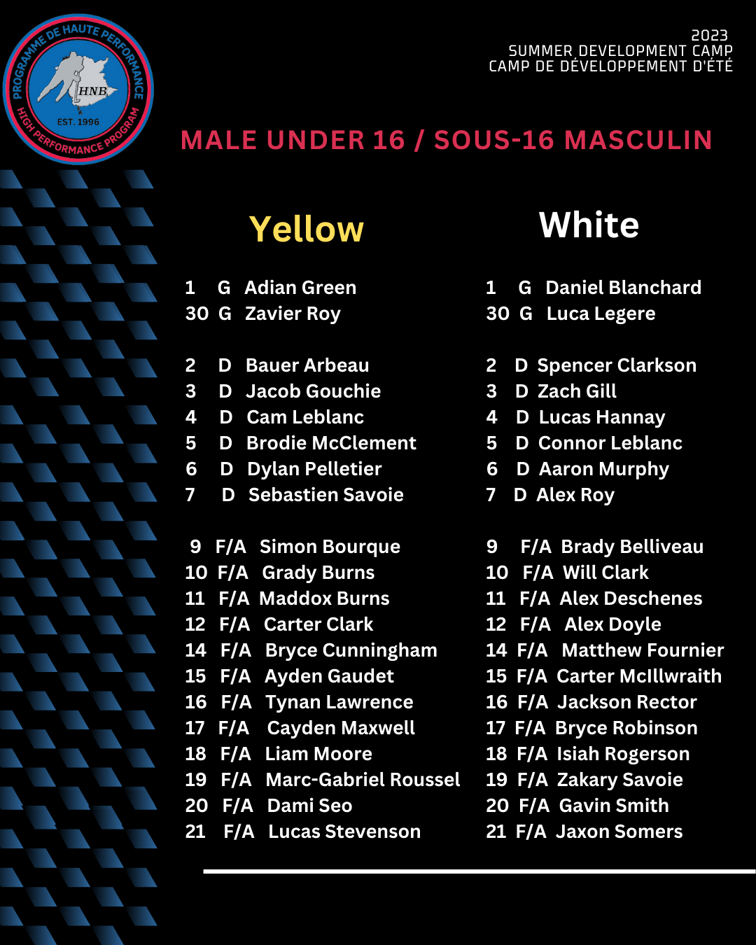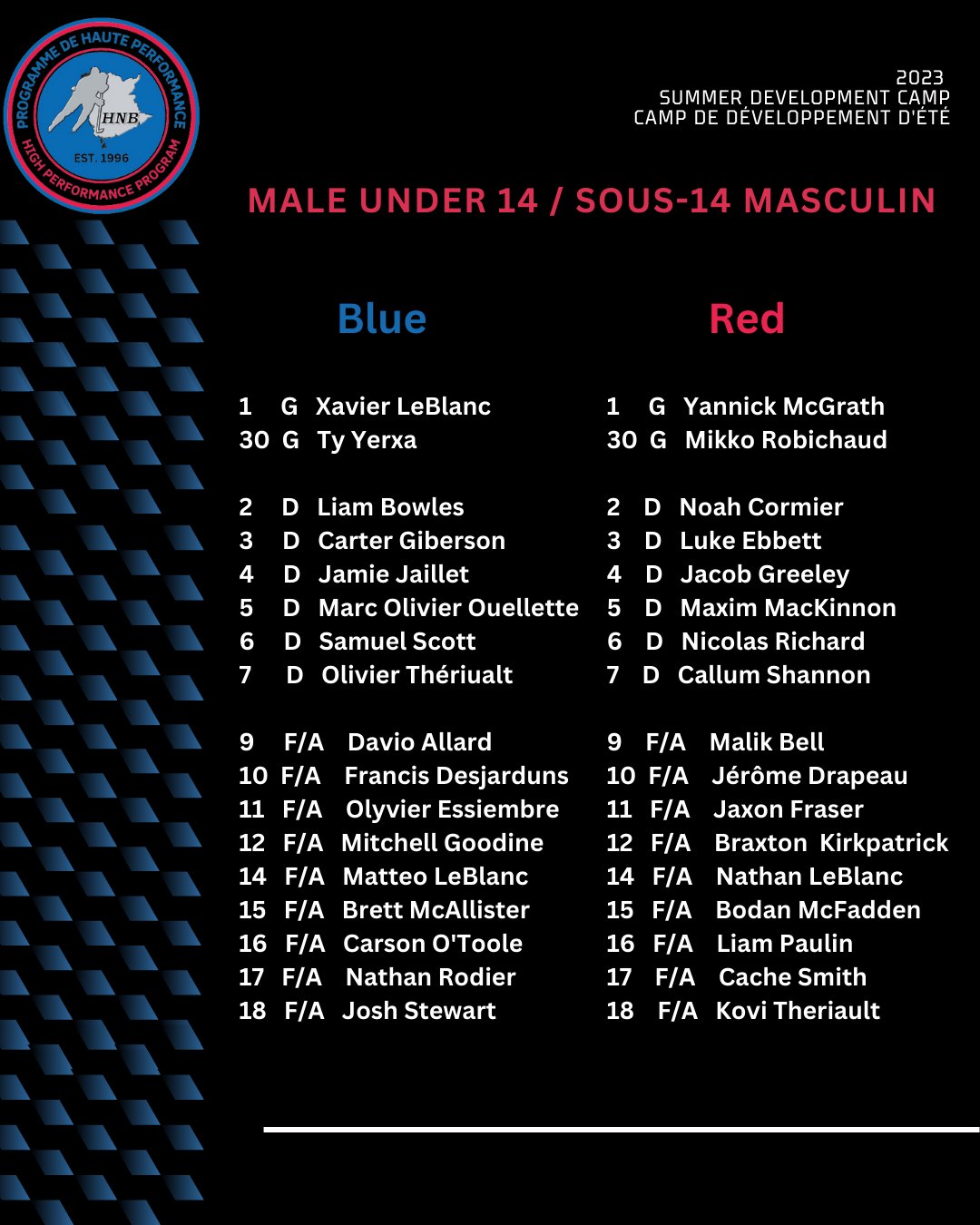 From the players invited, players will be selected in the Male Under-14, Male Under-15, Female Under-14, and Female Under-16 divisions to compete against the other Atlantic branches at the Atlantic Challenge Cup, held in Moncton on Thanksgiving weekend. The Male Under-16 division will compete in the QMJHL Cup during Thanksgiving weekend in Moncton.