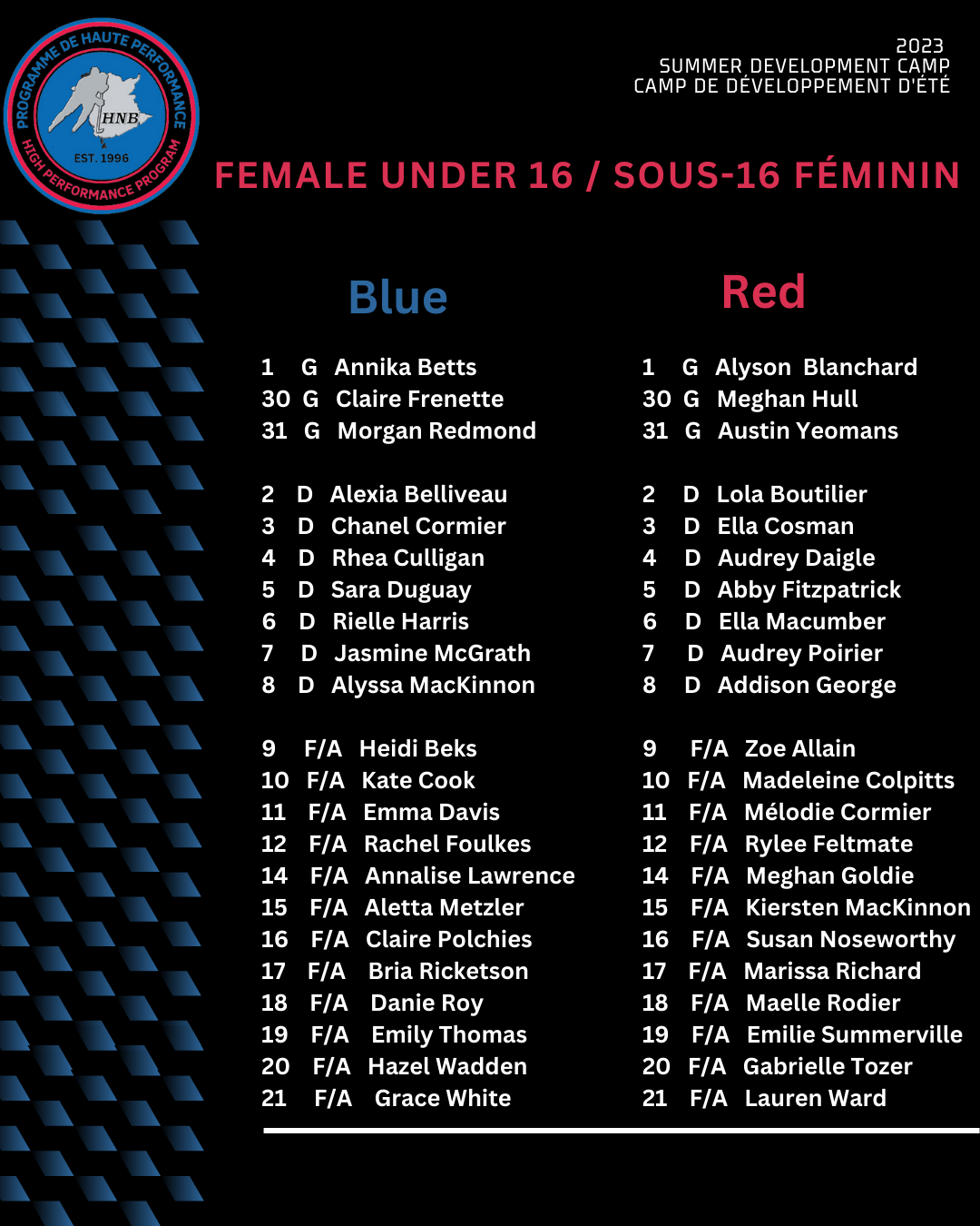 Fredericton, NB – July 17, 2023 – 240 male and female hockey players, in three divisions have been invited to participate in the Hockey New Brunswick Development Festival beginning July 17th. The camps will run over two weeks in Fredericton at the University of New Brunswick campus.